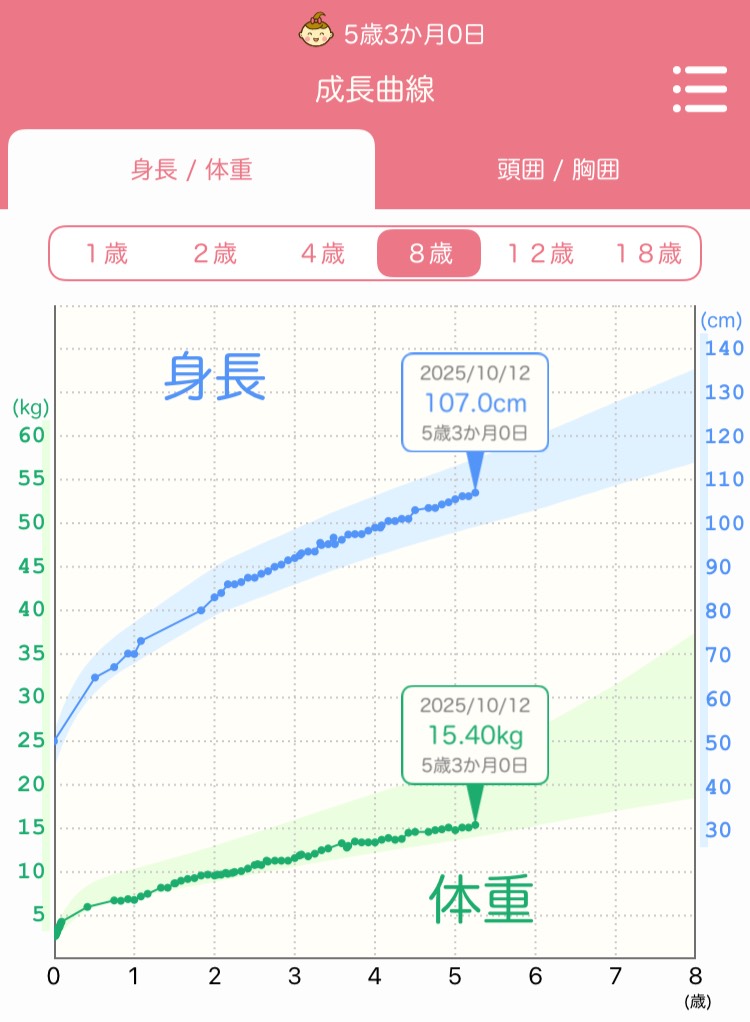 5歳3ヶ月は、身長107cm、体重15.4kgでした。