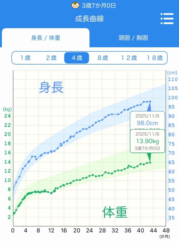 身長は97.8㎝、体重は13.8kgでした。