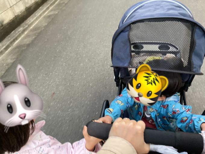 子ども達3人連れてのお出かけは、3人自転車に乗せられないので、2人乗りベビーカーで行っています。