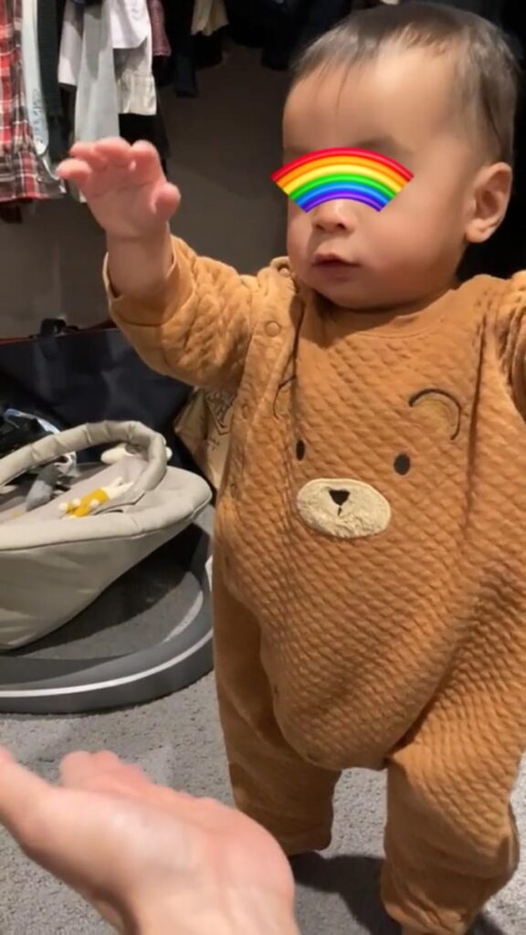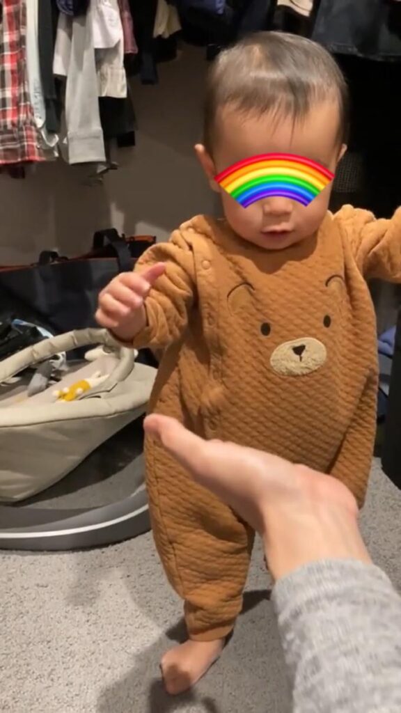 まだ1回しかやっていませんが、1人で何も掴まらないで立てたので、来月にはもっと歩けるようになっているかなと思います♪