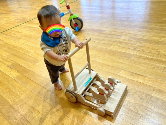 先日、児童館に行った時に手押し車があり、やらせてみると、1人で遊べるようになっていました。