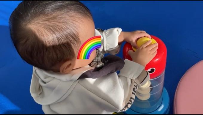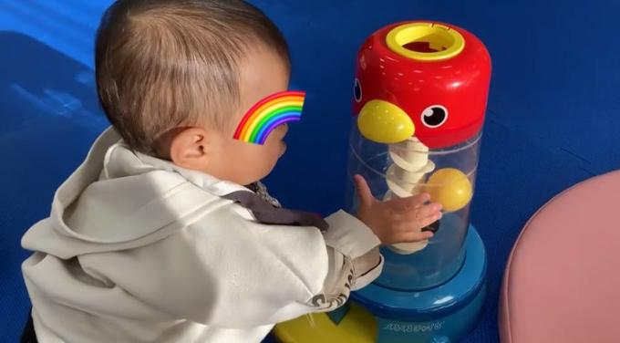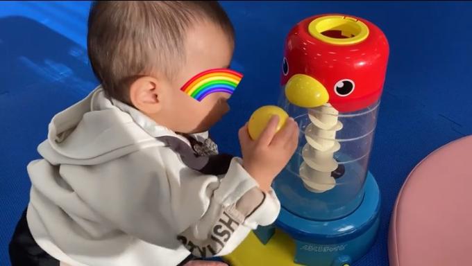 遊びたくても、なかなかボールが手から離れなくて遊べませんでしたが、しっかり穴のところで離せるようになりました!