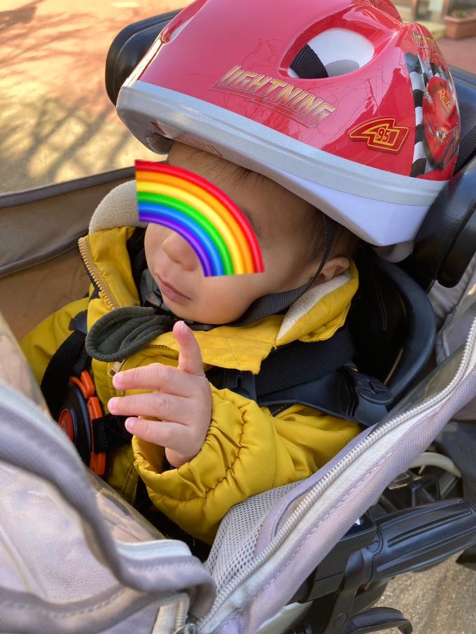 ヘルメットを被って、初めてチャイルドシートに座った時は、号泣。