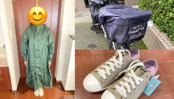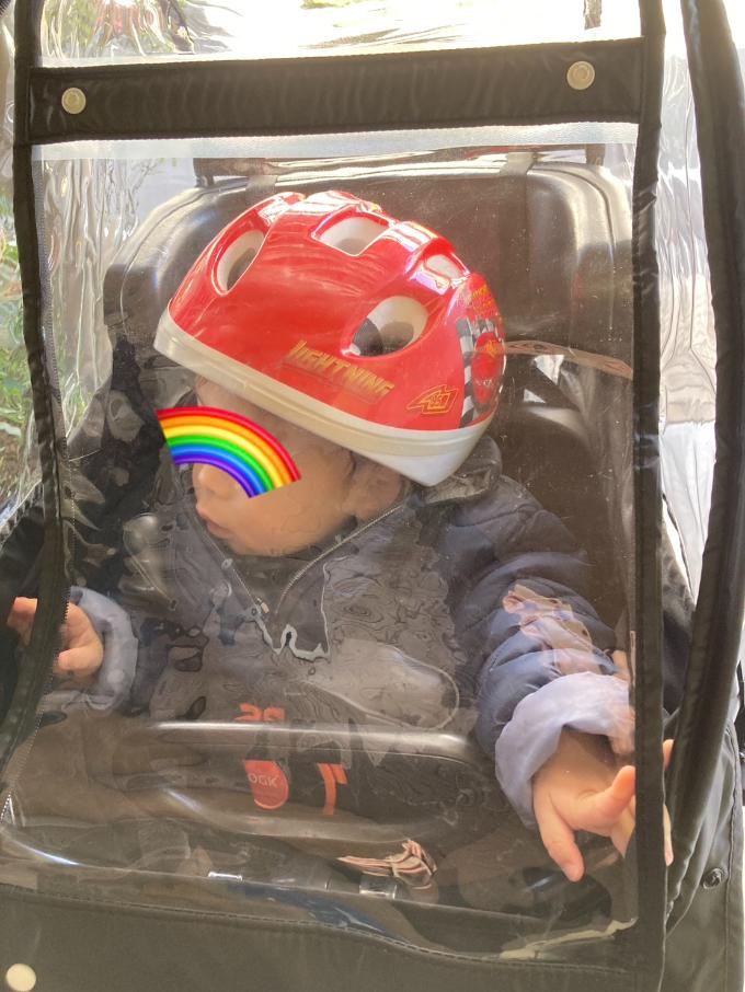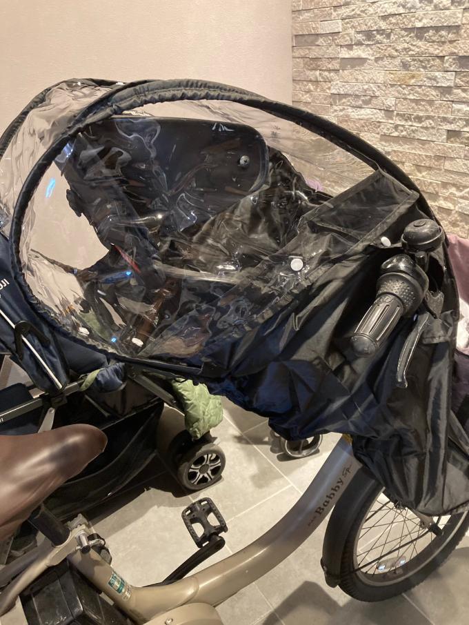 零を妊娠し、歩くよりも自転車に乗っていた方が楽で、雨の日はチャイルドシートにレインカバーをつけて、私はレインコートを着て乗っていました。