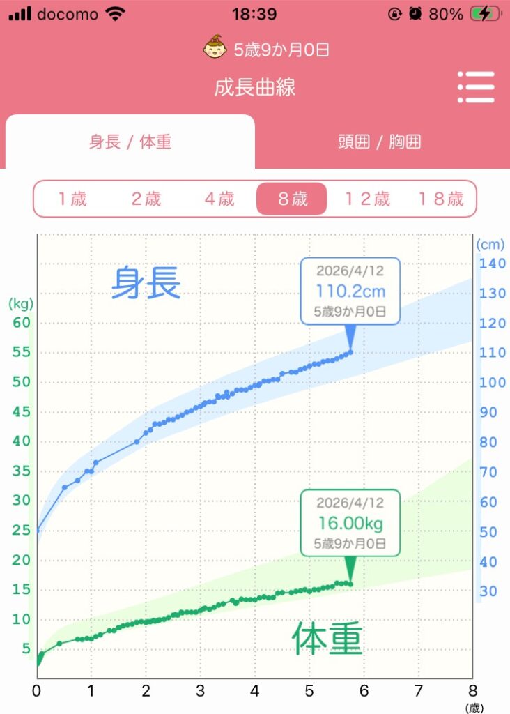 5歳9ヶ月は、身長110.2cm、体重16.0kgでした。